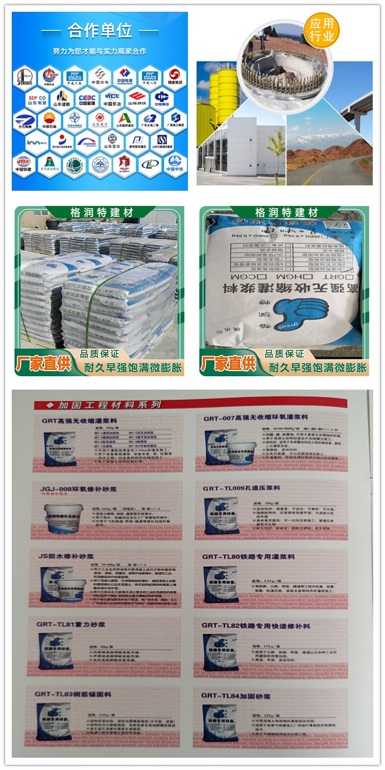 主要用于混凝土地面、路面的空鼓灌漿,以及橋面的裂縫修補。這種產品具有較好的補償收縮性、韌性、抗沖擊性和耐磨性,耐高溫和耐凍融循環性能好,耐久性優異。該產品利用水泥灌漿機進行施工。